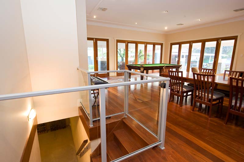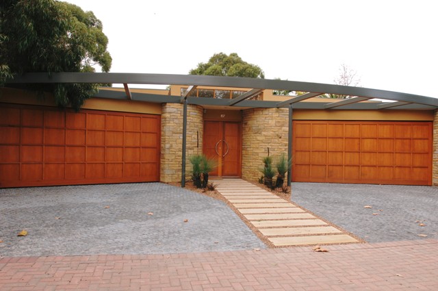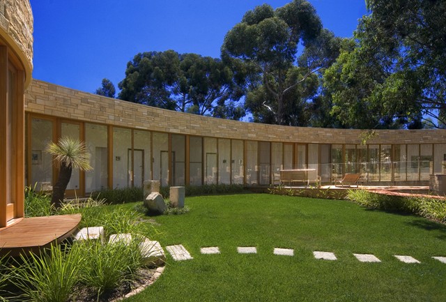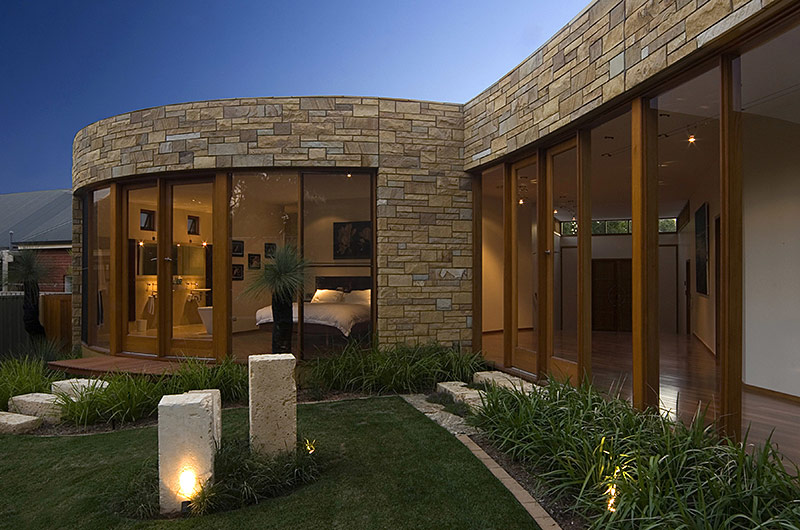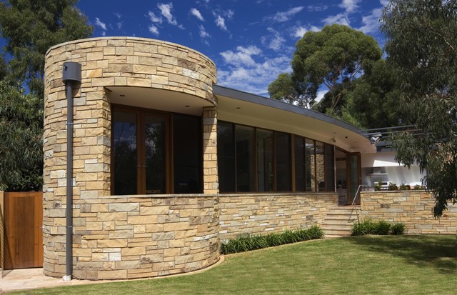 The client required a hi-tech home built of natural materials with timeless appeal. The Max Pritchard solution embraces design excellence, takes full advantage of the allotment, the adjoining park, the northerly aspect and a large existing eucalypt tree. From the front entry a long curved, central glass hallway reveals the extent of the design which has been masterfully constructed by the builder.
