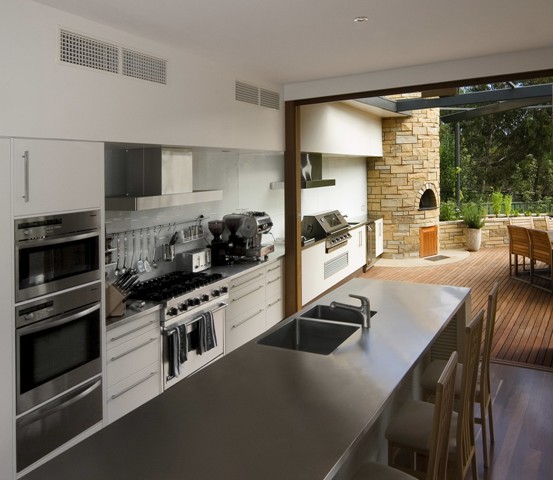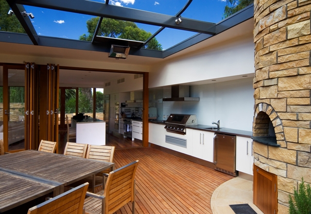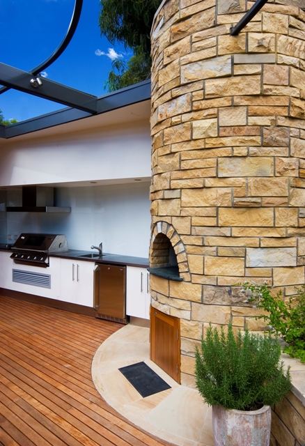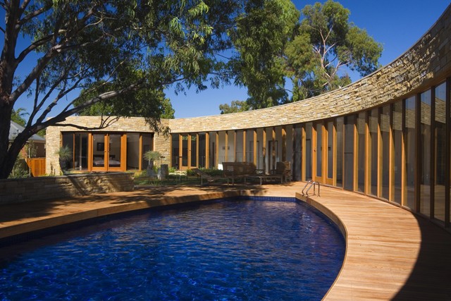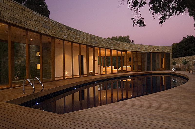 The outdoor living areas strongly influenced the design of this home. The kitchen flows out through cafe bifold glass doors onto a vine-covered timber deck with barbecue, sink fridge and a circular stone pizza oven. Views of the adjoining reserve can be enjoyed yet privacy maintained by discreet raised planter beds on the opposite side of the house. An eye-shaped pool mirrors the curve of the glass-walled gallery and provides reflected views from numerous rooms, while timber decking, lawns and large stone sculptures give an overall sense of serenity.
