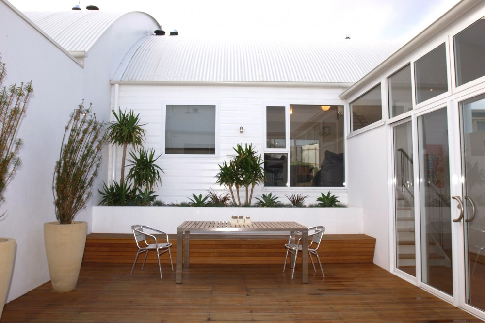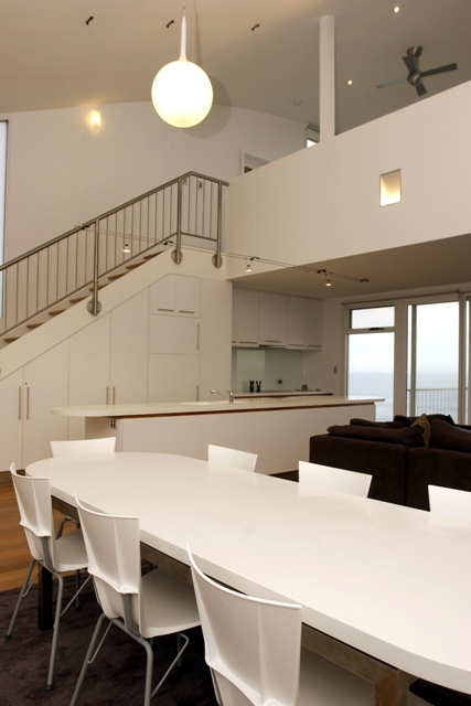 An innovative design solution for these two holiday apartments resulted in two distinct living pavilions stepping up the steep sloping site. A protected central courtyard provides a sheltered outdoor living area and capitalises on the northern aspect.